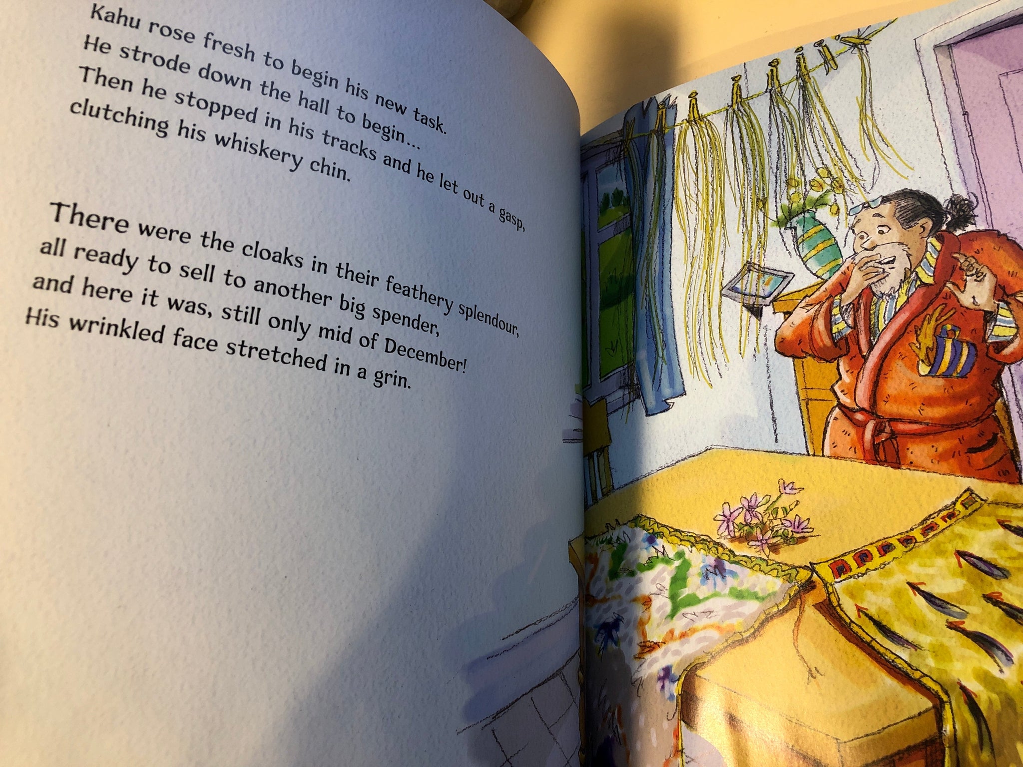 Tahi, rua, toru, wha, we bring feathers from afar. Our flying fingers weave a cloak, for we are special fairy folk. Kahu the cloakmaker has only enough materials left to make one cloak. But that night, as he and his wife sleep, they are visited by patupaiarehe (fairy folk), who make the finest cloak they have ever seen and Kahu might just get finished in time for Christmas after all.