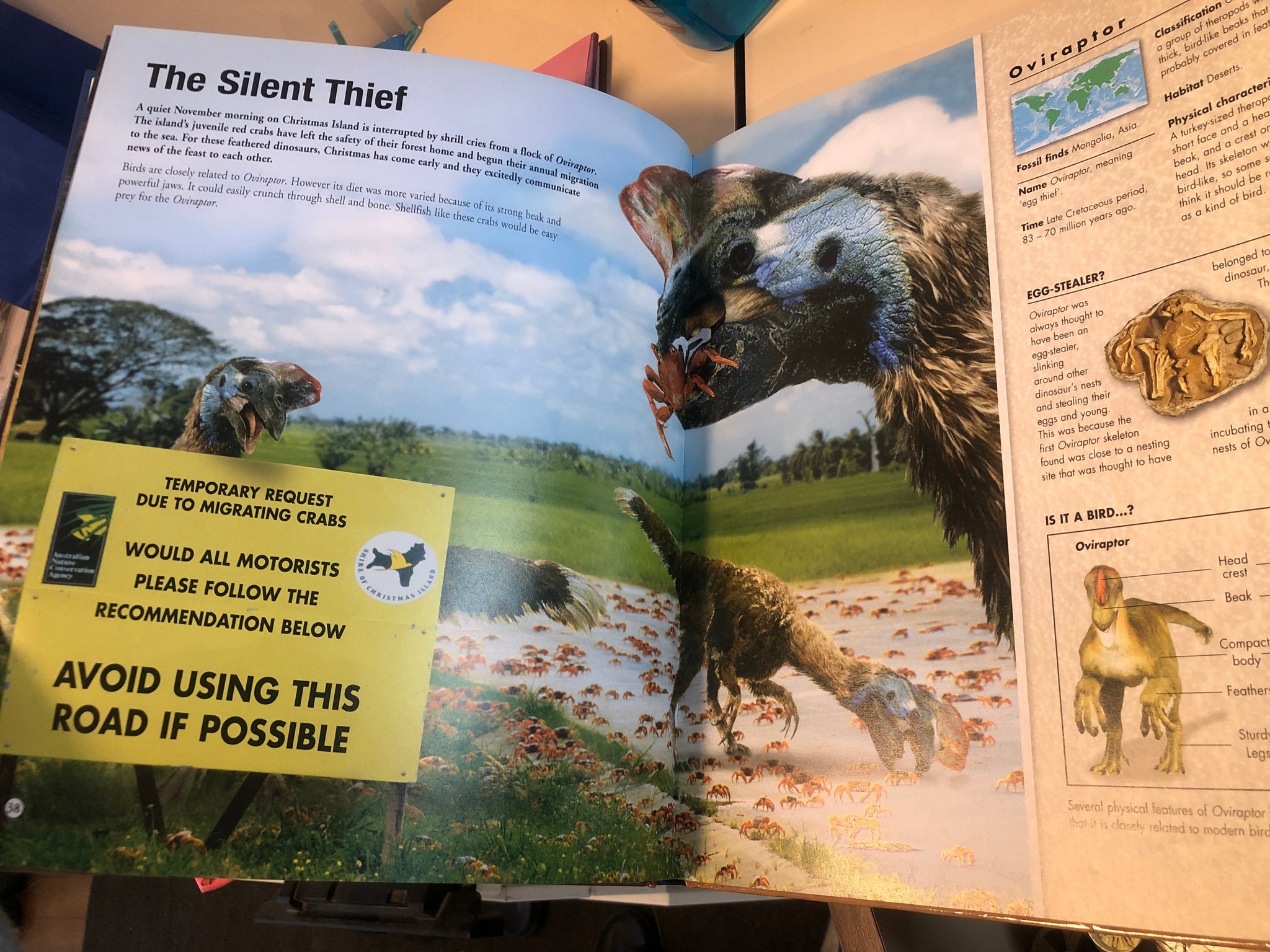 Open book showing a dinosaur and lions with educational text and illustrations on a table.