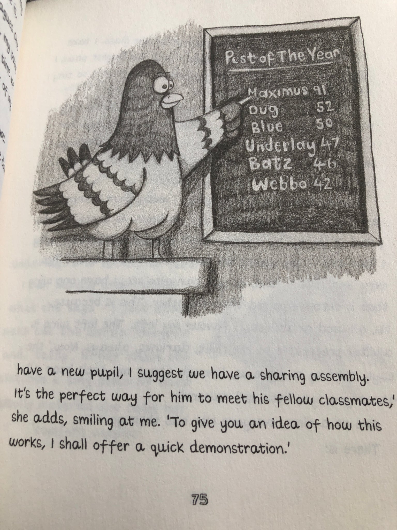 Cartoon of a bird pointing at a blackboard with text on a book page.